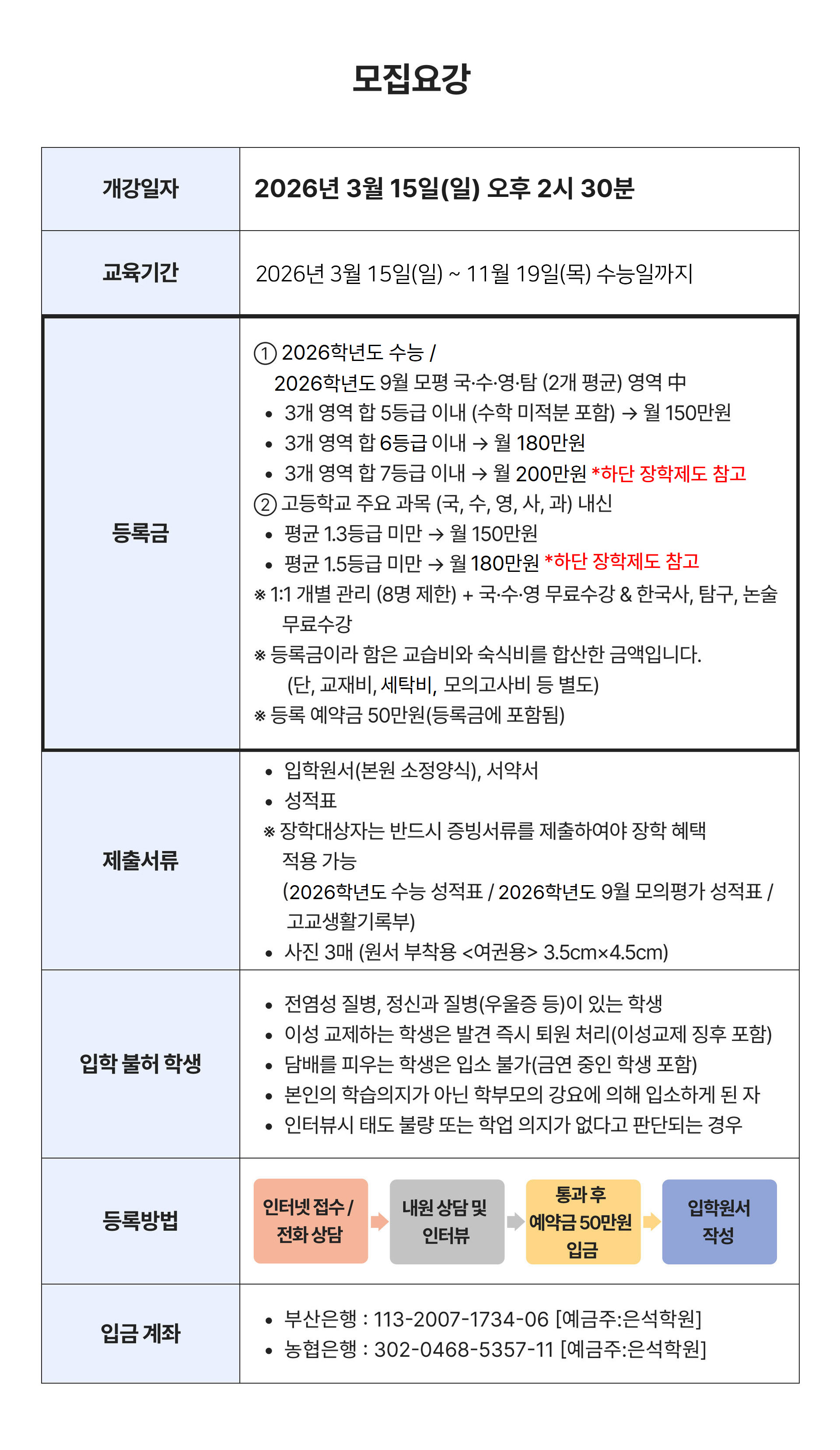 은석학원 사업자번호 : 622-95-01498 (학원설립운영 등록번호 제 입1호 |입시) | 대표 : 송긍복 외 2